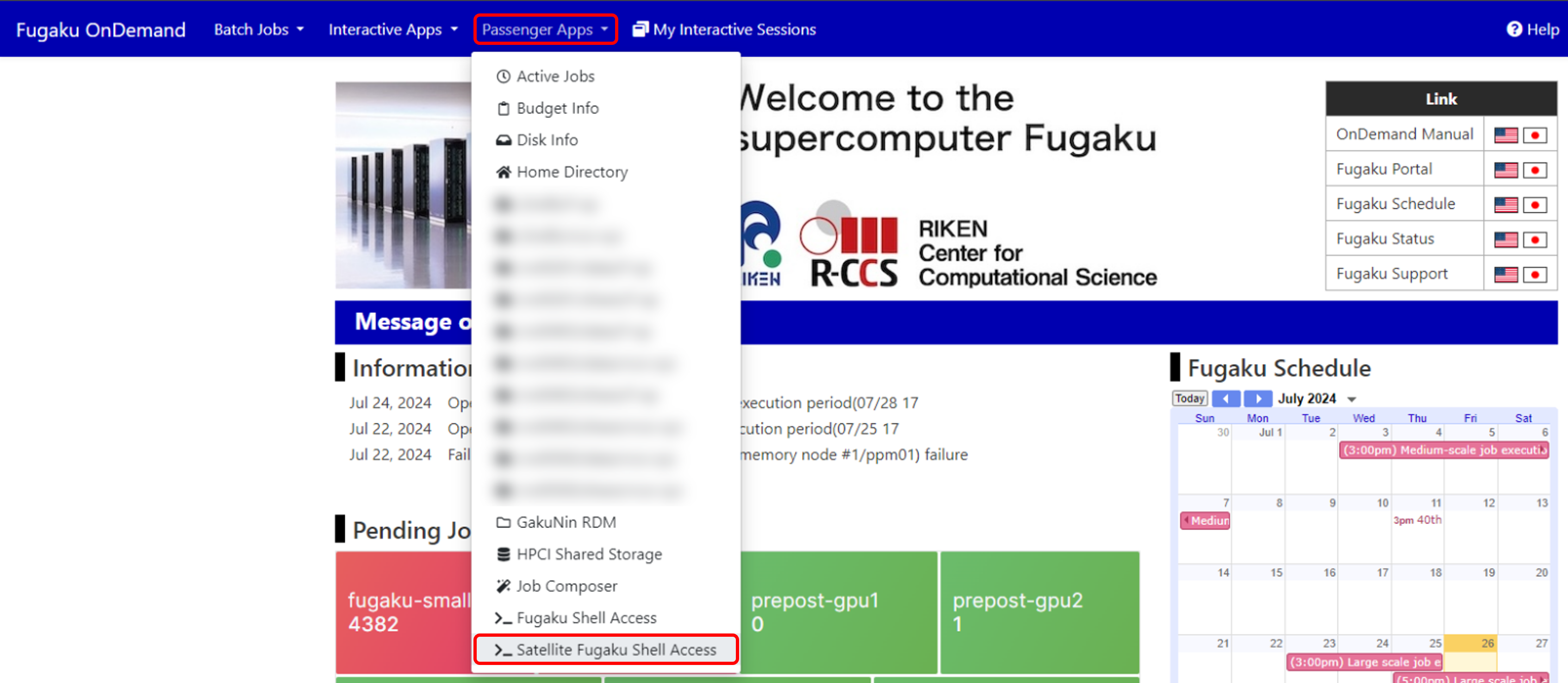 Please select “Satellite Fugaku Shell Access” in “Passenger Apps” of Fugaku Open OnDemand. How to use Fugaku Open OnDemand is explained in Fugaku Open OnDemand Guide.