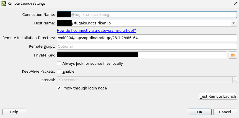In the ‘Remote Launch’ configuration section, the ‘Host Name’, ‘Remote Installation Directory’ and ‘Private Key’ must be entered.