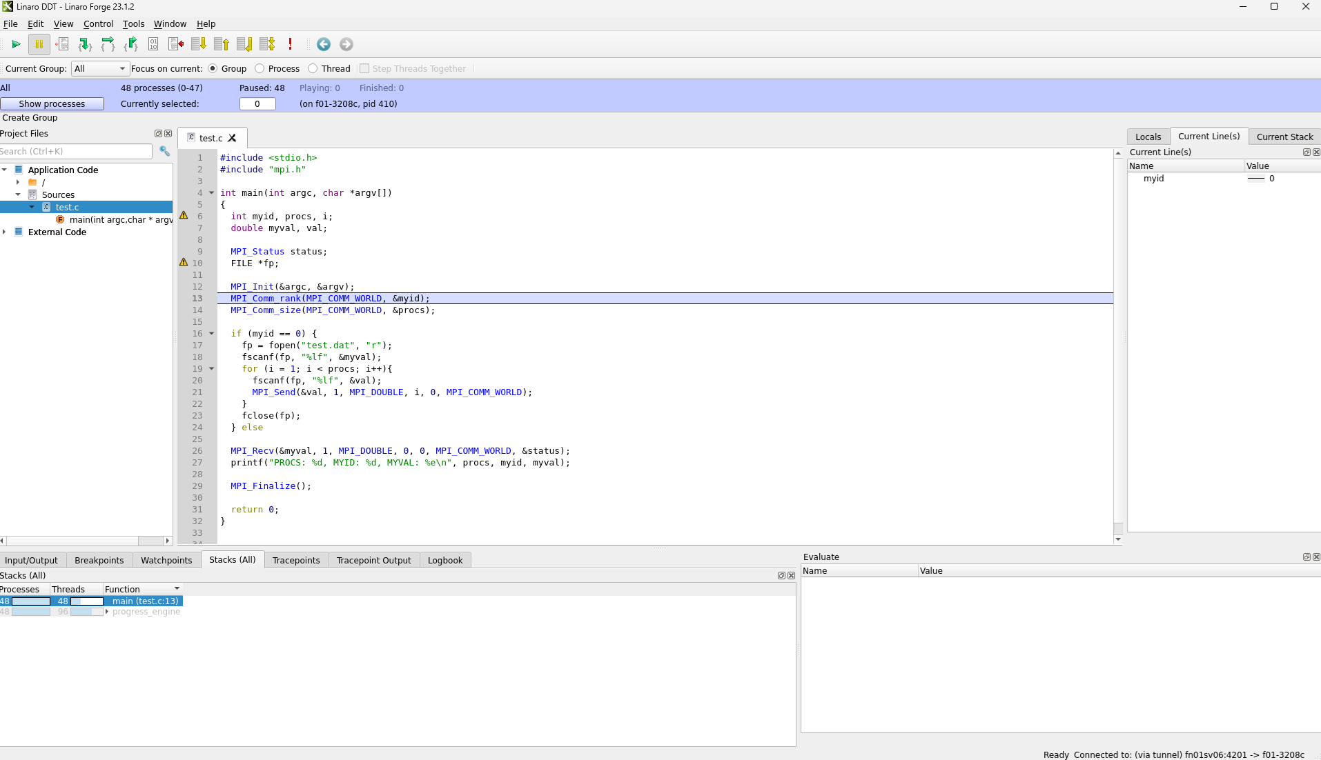Once the application is running, the Linaro Forge screen will look like the figure below. The application can then be debugged as a GUI debugger.
