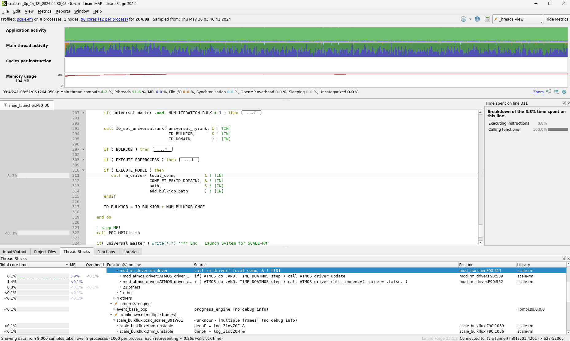 Once the application is running, the Linaro Forge screen will look like the figure below. The application can be analysed as a GUI performance analysis tool. Once the MAP has been successfully executed, a map file is generated, which can be re-loaded to re-analyses the job without running it.