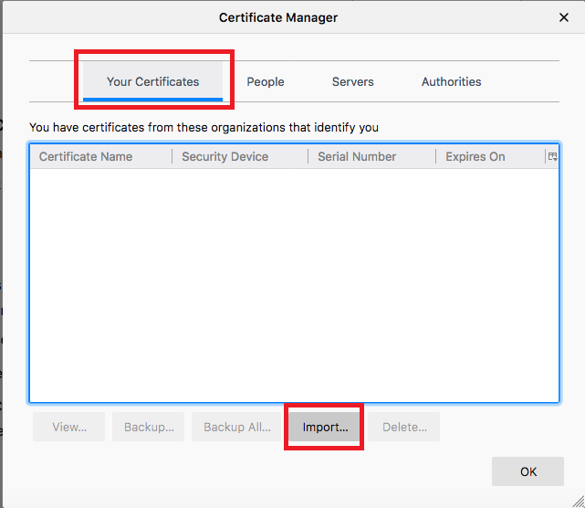 Once certificate manager started, select [Your certificate] then click [Import…].