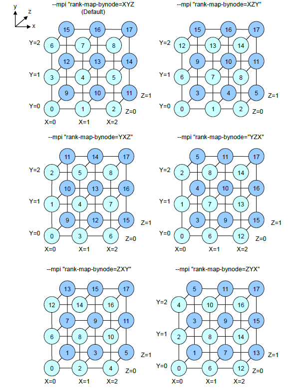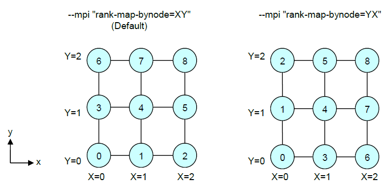 When one process is created on a compute node, rank-map-bynode moves to the next compute node and automatically allocates it in a round-robin fashion. The origin of the coordinates is rank 0, the rank is arranged in the axis direction of the first character of rank-map-bynode, and when the upper limit is reached, the character moves to the next character.